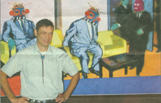 Pressewoche, März 2007 Der Münchner Maler Bernhard Springer kommt mit TRANSLATOR X nach Aschau im Chiemgau und bringt unter diesem Titel einige Bilderserien mit - Maskiertes, Lustvolles, Magisches. Das muss alles raus. Farbe. Bewegung. Gestaltung. Der Kopf saust, er quillt schier über. Wo ist die Leinwand, die Wellpappe, die Sprühdose, das Acryl? Ah, Erleichterung, fertig ist das Bild, quirlig, bewegt, zwar gebannt auf einer Fläche, aber irgendwie verselbstständigt sich das Motiv und nimmt den Betrachter mit auf eine Reise, die den Bilderrahmen weit hinter sich läßt. Bernhard Springer ist der 3D-Erzähler unter den Malern. (...) Mit Translator X zeigt er in Aschau eine Bilderserie aus dem Jahr 2006. Ein russischer Übersetzer hat es ihm angetan, der über 20 Jahre immer mit im Bild war, wenn sich die politischen Weltgrößen trafen. Die Größen wechselten, der Translator blieb. Name unbekannt, also X. "Die Spielerei mit der Frage, wer nun der Held ist, ist die Konzeptidee (..) (Regina Semmler, in: furorum der Pressewoche, 18.03.2007) |